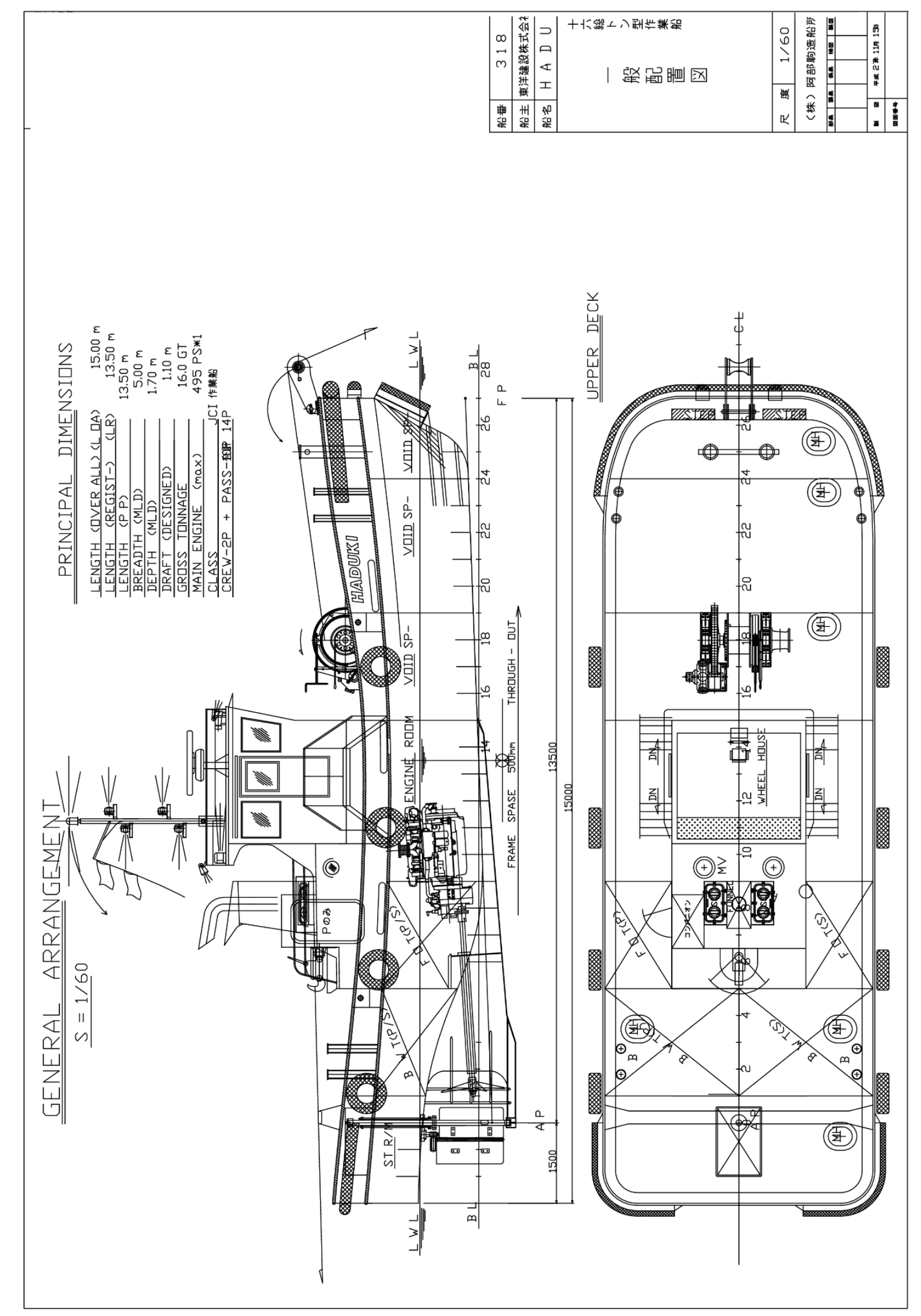 Ship introduction船舶紹介 Home 船舶紹介 揚錨船 HADUKI 揚錨船HADUKI 船舶概要 船種 揚錨船 船名 HADUKI 総屯数 16.0t 建造年 2016 航行区域 近海 船体主要寸法 (m) 長(L) 13.5m 幅(B) 5.0m 深(D) 1.8m 喫水 1.1m 動力性能・動力装置 航海速力 11ノット 推進機関 430kW×1基 (612PS×1 基) 一般配置図 PDFを開く