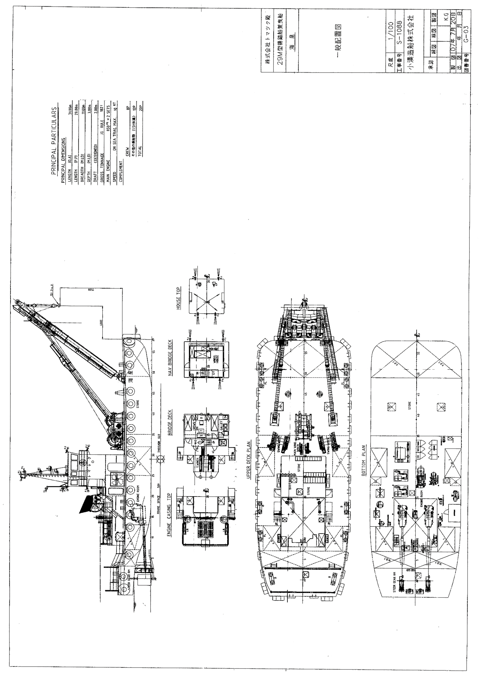 Ship introduction船舶紹介 Home 船舶紹介 揚錨船 海皇 揚錨船海皇 船舶概要 船種 揚錨船 船名 海 皇 総屯数 182t 建造年 2008 航行区域 限定沿海 船体主要寸法 (m) 長(L) 29.0m 幅(B) 11.0m 深(D) 3.0m 喫水 2.0m 動力性能・動力装置 航海速力 10ノット 推進機関 625kW×2基 (850PS×2 基) 巻上能力 490.0kN(50tf) クレーン定格荷重 147.0kN(15tf) 一般配置図 PDFを開く