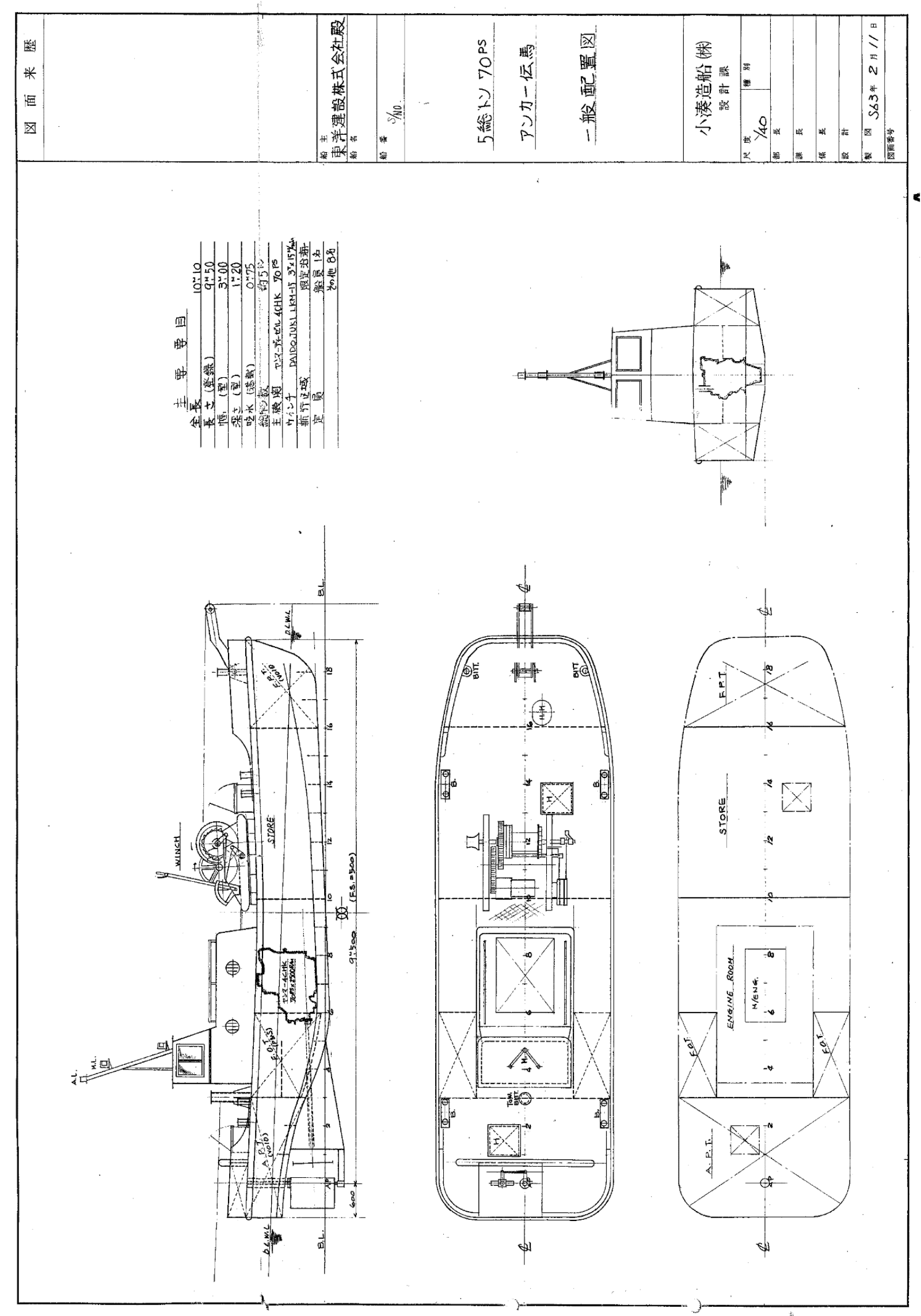 Ship introduction船舶紹介 Home 船舶紹介 揚錨船 さんご3号 揚錨船さんご3号 船舶概要 船種 揚錨船 船名 さんご3号 総屯数 4.7t 建造年 1988 航行区域 限定沿海 船体主要寸法 (m) 長(L) 9.5m 幅(B) 3.0m 深(D) 1.2m 喫水 0.75m 動力性能・動力装置 航海速力 6ノット 推進機関 51.5kW×1基 (70PS×1 基) 巻上能力 29.4kN(3tf) 一般配置図 PDFを開く