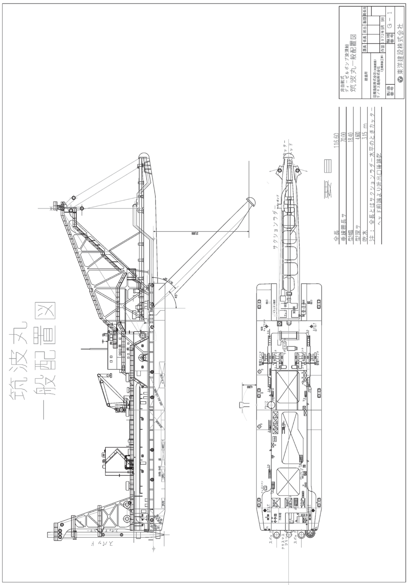 Ship introduction船舶紹介 Home 船舶紹介 ポンプ式浚渫船 筑波丸 ポンプ式浚渫船筑波丸 船舶概要 船種 ポンプ式浚渫船 船名 筑波丸 排水屯数 4,300t 建造年 1972(2016改造) 船体主要寸法 (m) 長(L) 70.0m 幅(B) 18.4m 深(D) 4.6m 喫水 3.5m 動力性能・動力装置 全装備機関出力 8,680kW(11,800PS) 公称浚渫能力 1,200(㎥/h) 排砂管径 860mm 排送距離 6,500m 浚渫深度 27.0m 一般配置図 PDFを開く